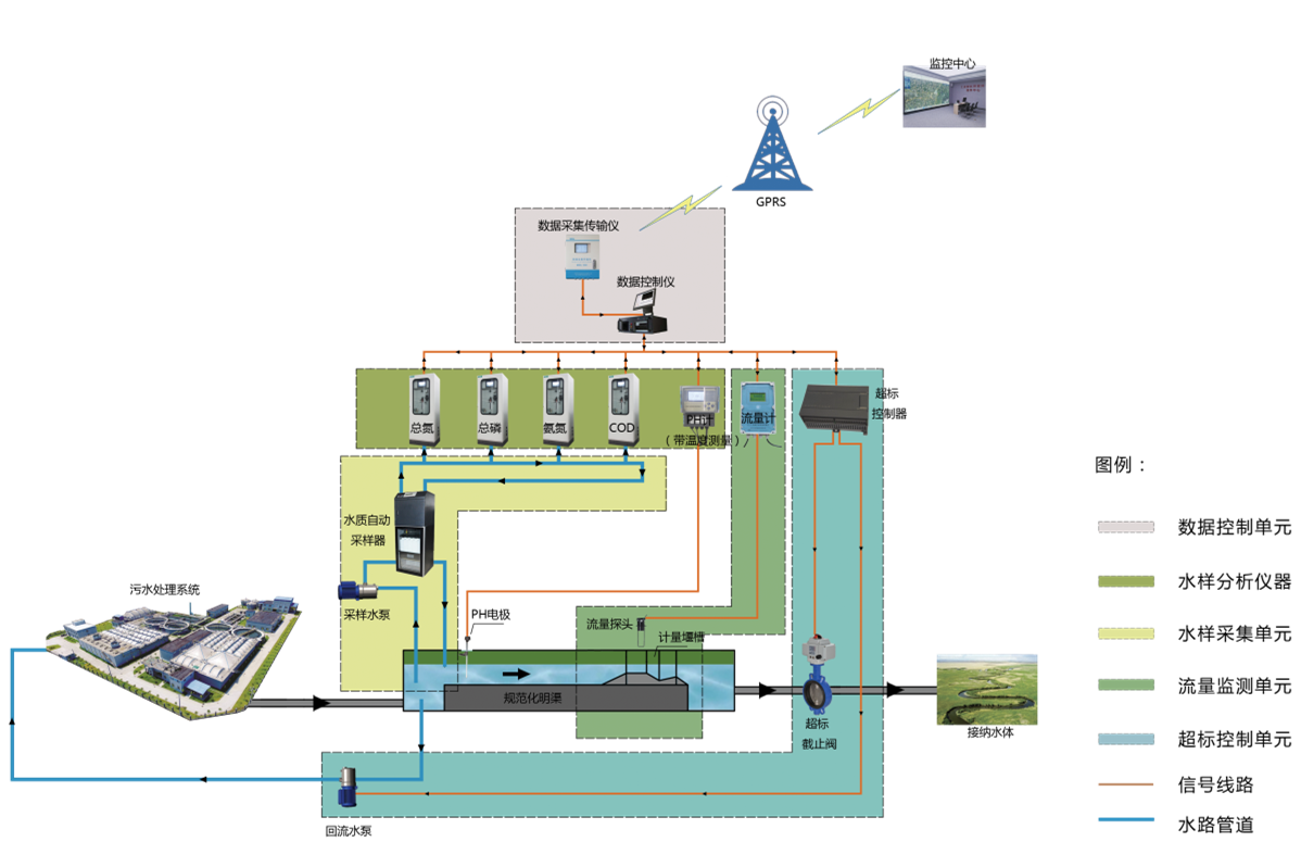 污染源水質在線監測系統適用于各排污企業對污染源水質排污監控及控制的需求。該系統根據2020年國家技術規范(HJ353-2019)和其他標準進行設計,由實現水污染源流量監測、水污染源水樣采集、分析及分析數據統計與上傳等功能的軟硬件設施組成的系統。該系統具有監測數據實時采集、傳輸、管理、質控、反控等功能,還具有水質治理設施運行情況分析功能和排污總量控制功能。